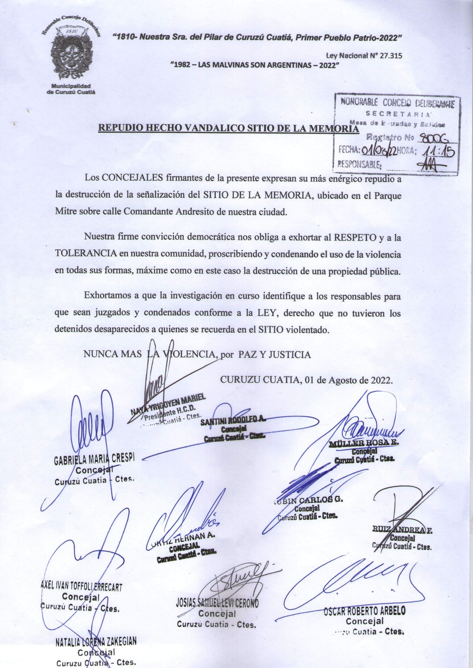 A través de una nota firmada por la totalidad de los ediles curuzucuateños, hacen público el repudio por la vandalización de la señalización en el Sitio de la Memoria ubicado en el Parque Mitre sobre calle Comandante Andresito el pasado fin de semana.