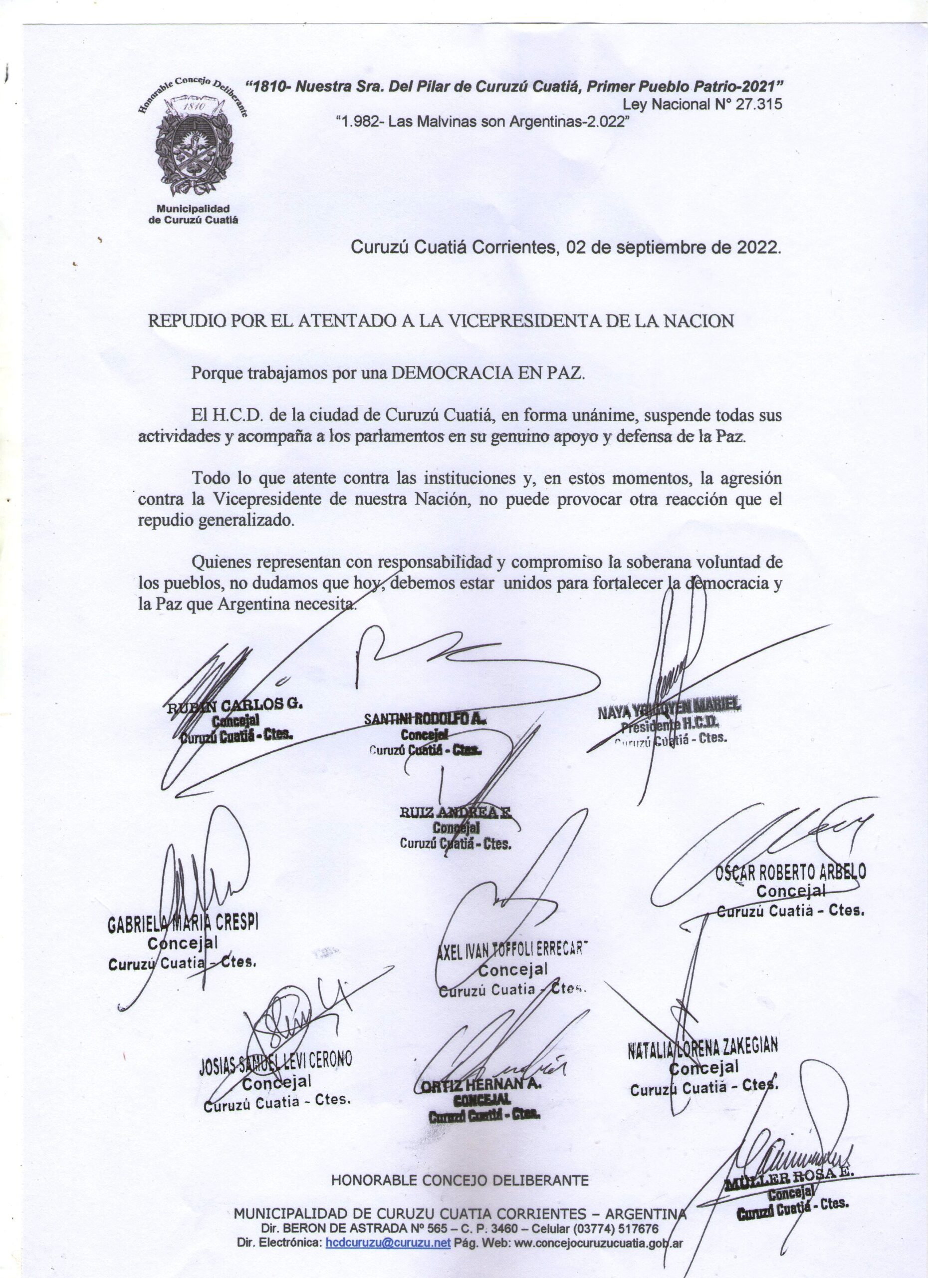 El H.C.D. de la ciudad de Curuzú Cuatiá, en forma unánime, suspende todas sus actividades y acompaña a los parlamentos en su genuino apoyo y defensa de la Paz.